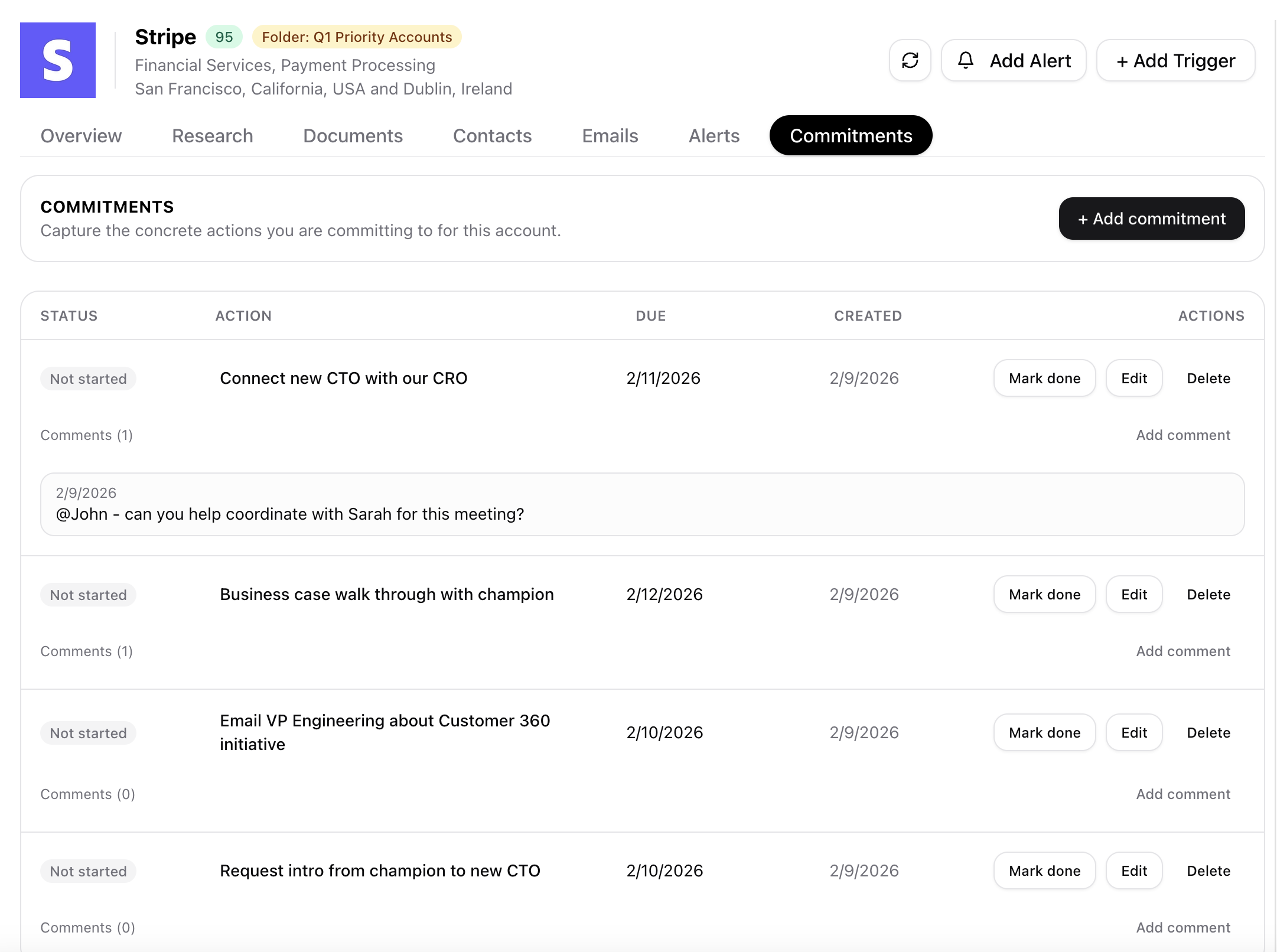 Turn account plans into accountable execution with clear manager visibility into rep commitments, due dates and status.